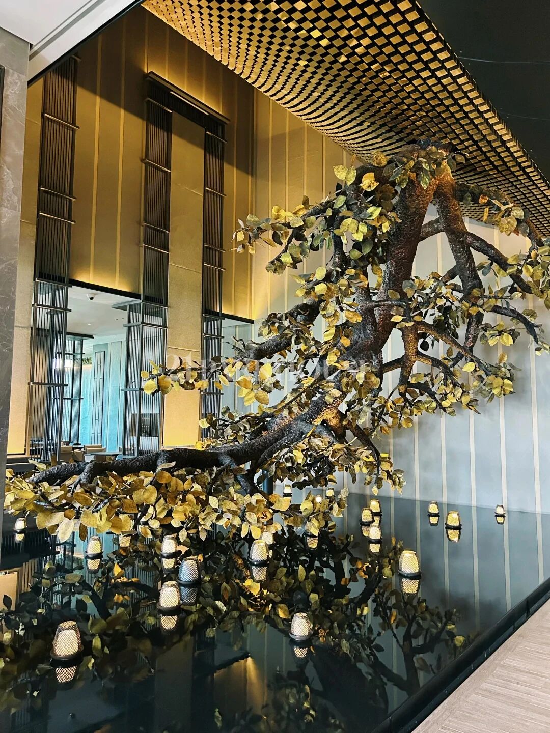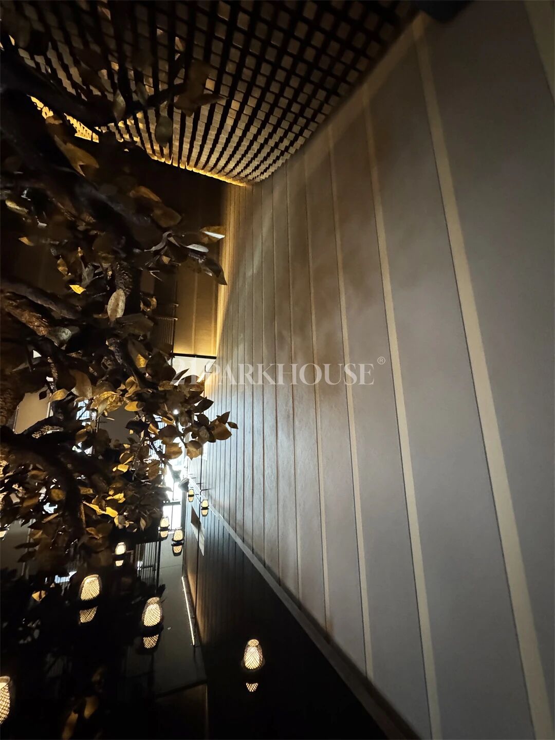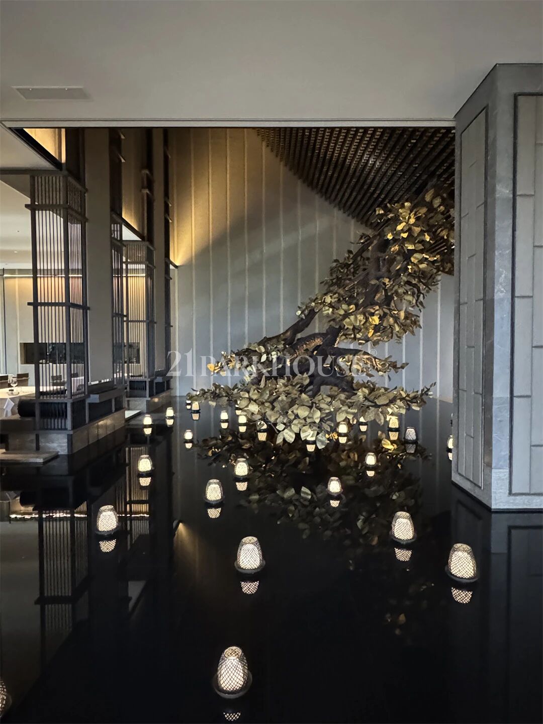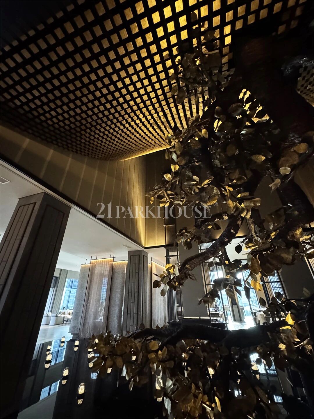 At the heart of the lobby, an oval atrium is anchored by a century-old tree. Light filters through intricately designed wooden lattices, casting ripple-like shadows across the floor to create a visual sense of airy openness and transparency.