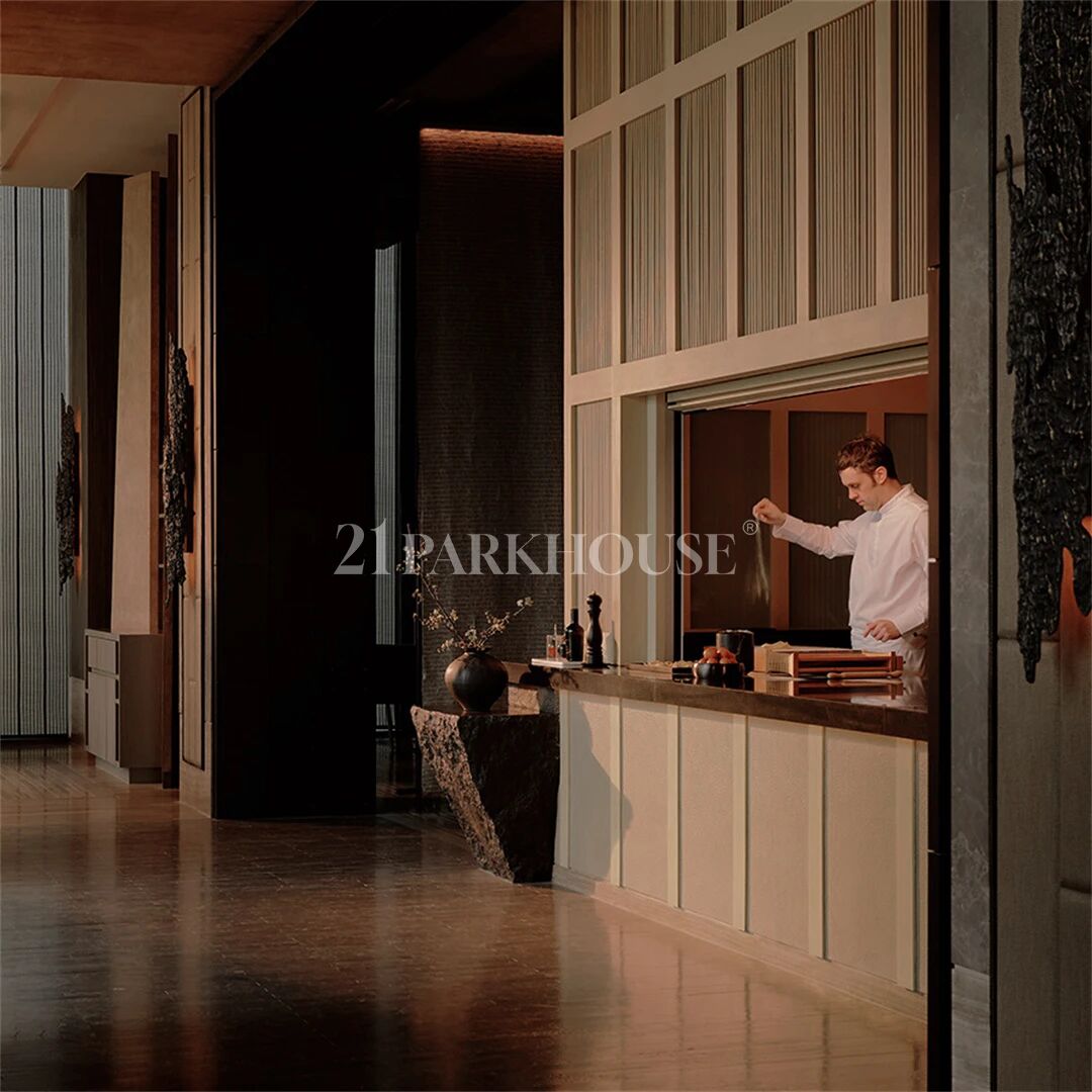 The walls feature light-colored stone and teak, inviting the organic breath of the jungle indoors and establishing a material dialogue between history and modernity. The designers ingeniously incorporated 21Parkhouse® Flexible Stone as the interior wall finish. As light filters through the openwork screens, the bamboo texture flows between the solid and the void, evoking an otherworldly sense of serenity and timeless distance.