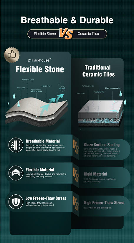 Rigid materials, like ceramic tiles, are easily damaged by the stress of freezing and thawing. They often crack or fall off. In contrast, Flexible Stone is flexible, lightweight, and breathable. It handles deformation better than tiles, so freeze-thaw stress has almost no effect on it.